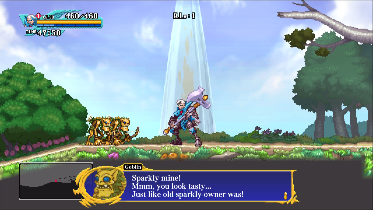 Go left until you find an old woman and talk to her, she’ll tell you about her son. Keep going left until you’re stopped by two yellow goblins, kill them and they’ll drop a chest with a pendant. Return to the old lady and give it to her then you can proceed with the rest of the level.